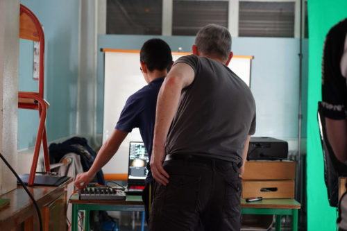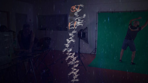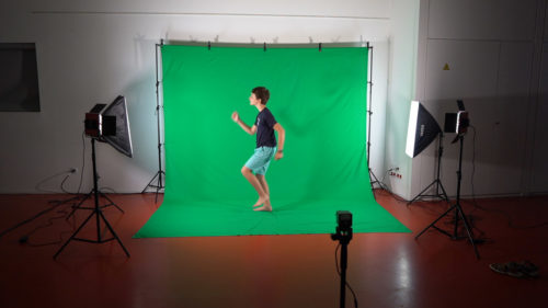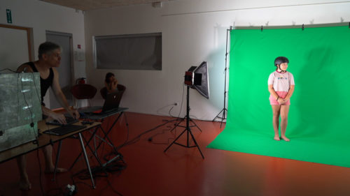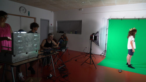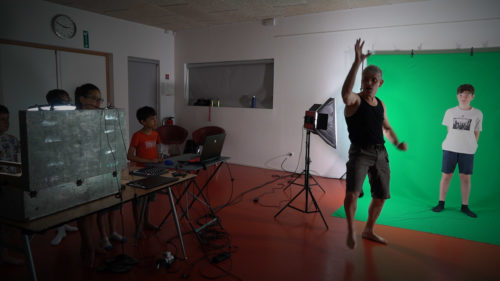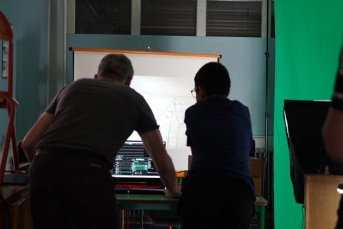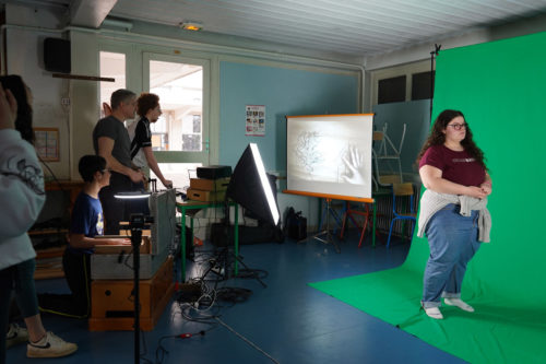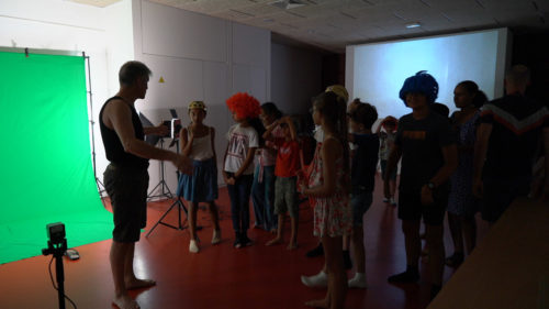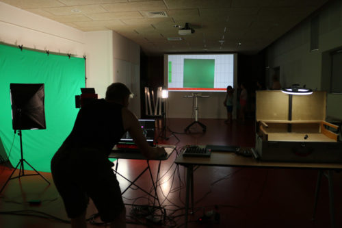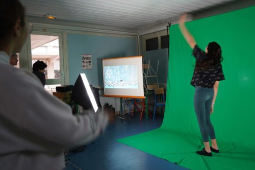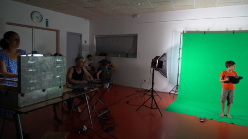 Etape 3 : Groupe de pratique « fond vert » : 1 personne “acteur” sur fond vert, 2 personnes animation des décors, 2 personnes « manipulations techniques » depuis la régie.