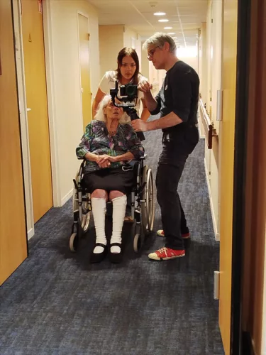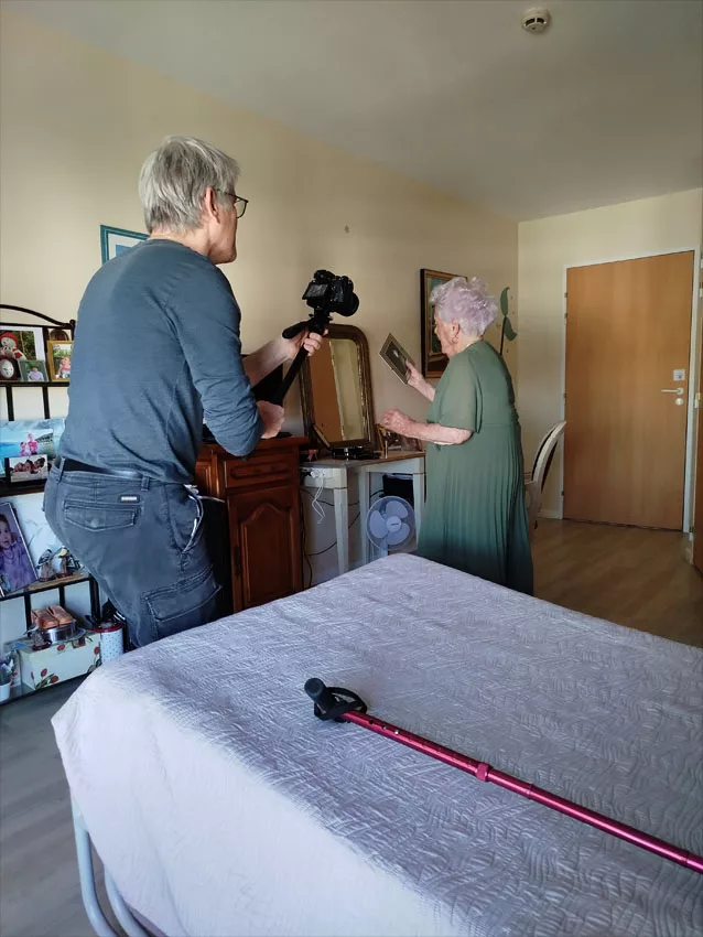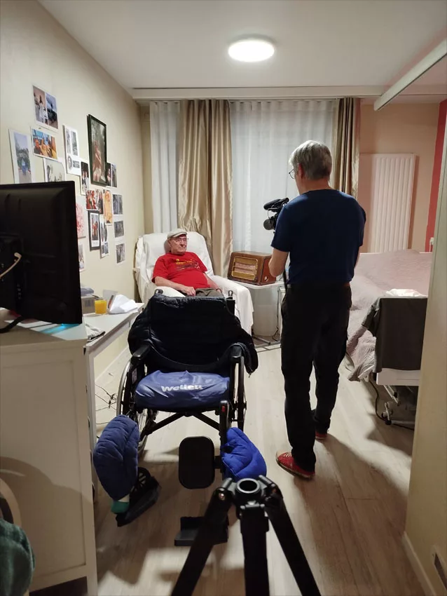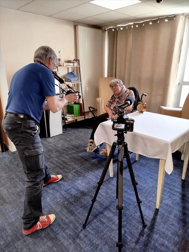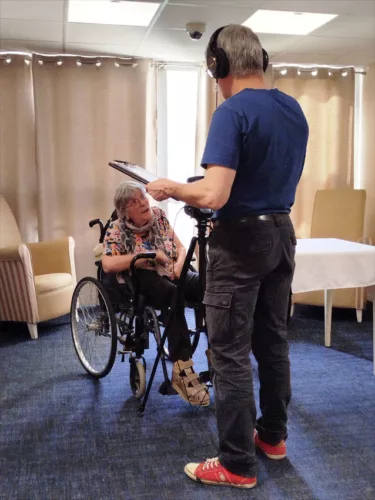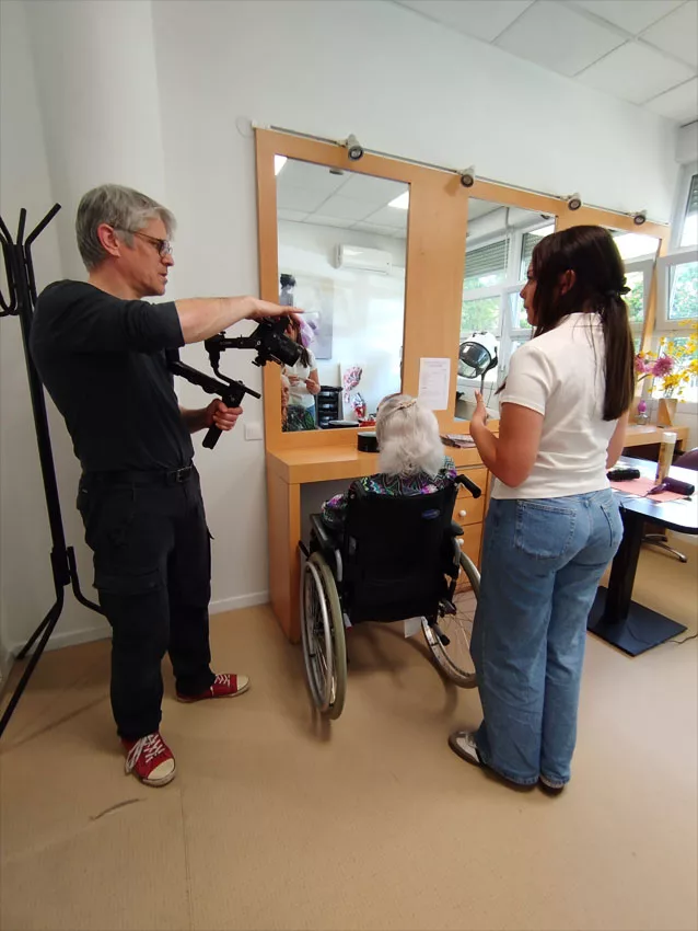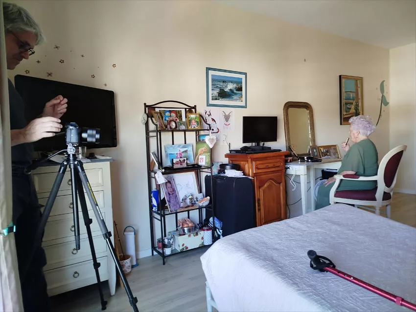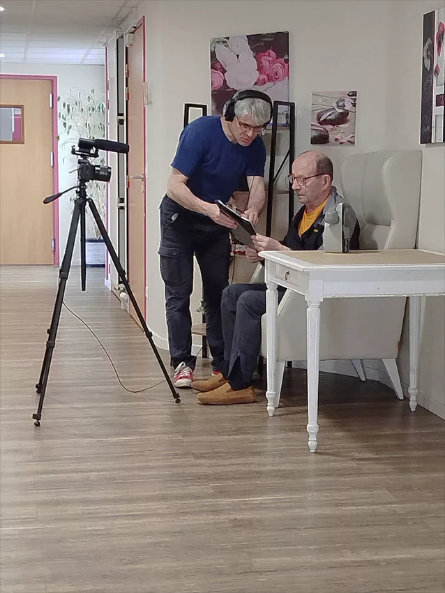 Le tournage se passe bien jusqu’à ce que Guillaume dise qu’il va sortir le scorpion pour la suite, regards inquiets entre Mme Vernu et Laetitia que nous désamorçons tout de suite en expliquant que c’est le nom d’un stabilisateur pour la caméra en forme de scorpion : soulagement. La dernière prise de vue est un suivi de Mme Vernu sur son fauteuil dans les couloirs avec Guillaume qui filme à reculons. Dans le cheminement il y a un virage à prendre qui change l’angle et fait apparaitre des résidents de dos qui regardent la télévision mais surtout Laetitia, qui se projette au sol en urgence. Fin de tournage sur un fou rire collectif.