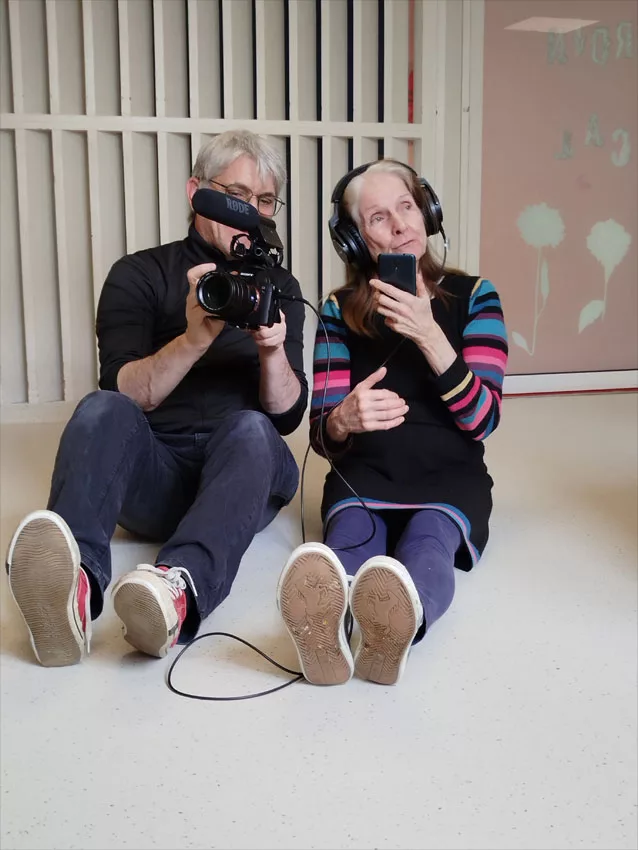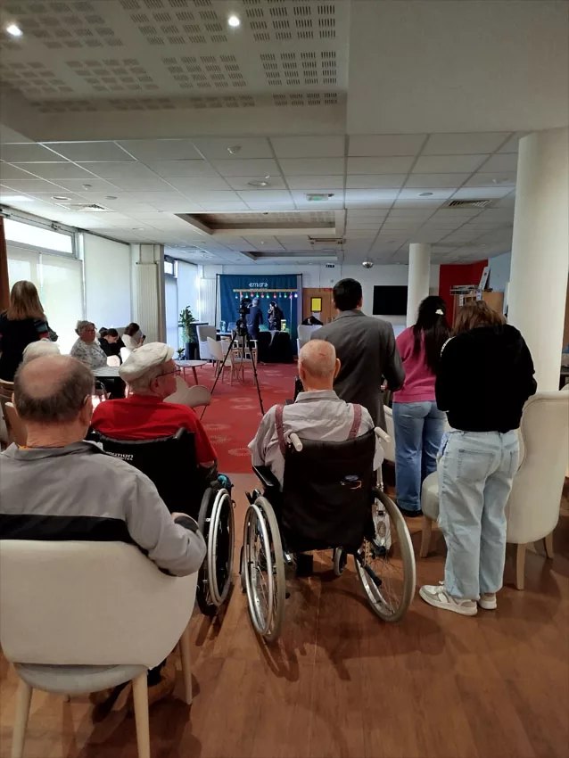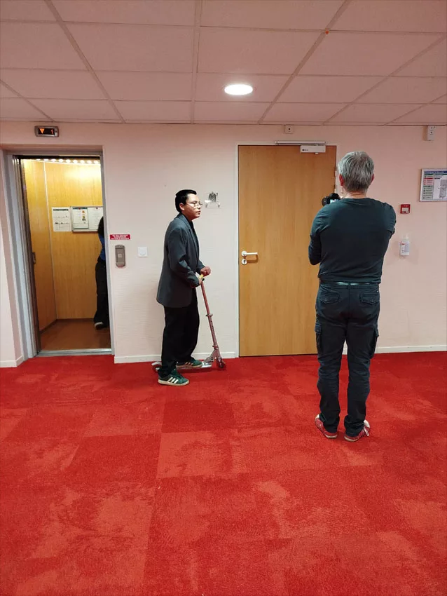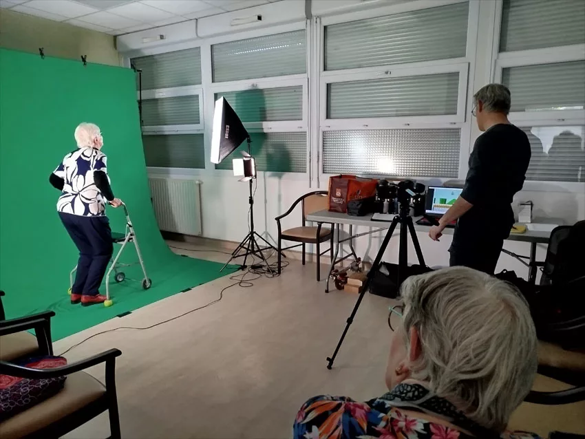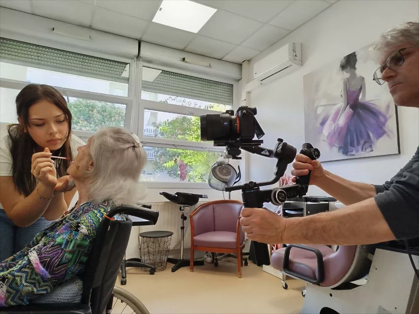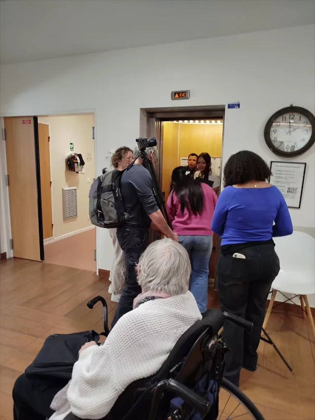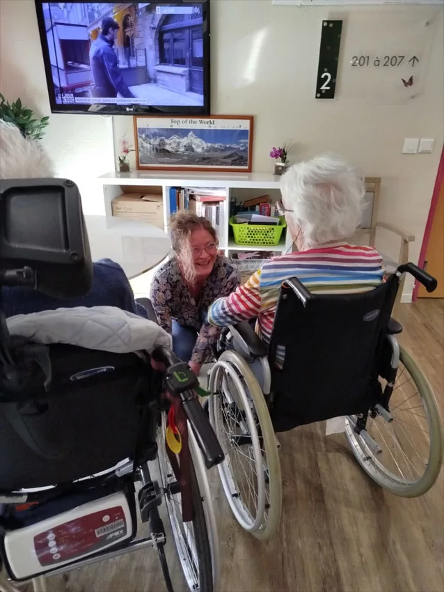 Le tournage se passe bien jusqu’à ce que Guillaume dise qu’il va sortir le scorpion pour la suite, regards inquiets entre Mme Vernu et Laetitia que nous désamorçons tout de suite en expliquant que c’est le nom d’un stabilisateur pour la caméra en forme de scorpion : soulagement. La dernière prise de vue est un suivi de Mme Vernu sur son fauteuil dans les couloirs avec Guillaume qui filme à reculons. Dans le cheminement il y a un virage à prendre qui change l’angle et fait apparaitre des résidents de dos qui regardent la télévision mais surtout Laetitia, qui se projette au sol en urgence. Fin de tournage sur un fou rire collectif.