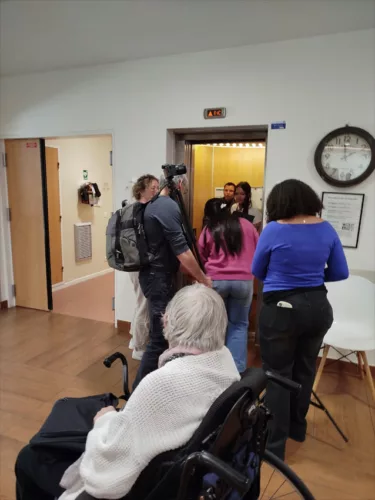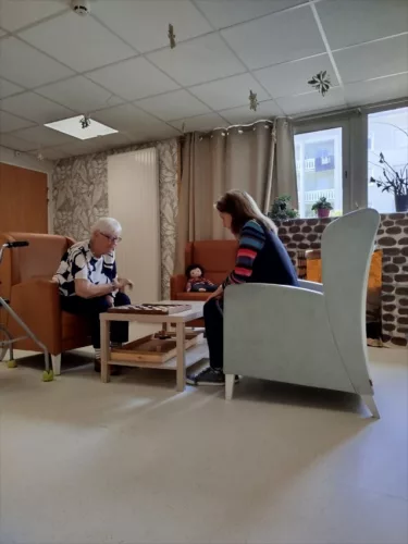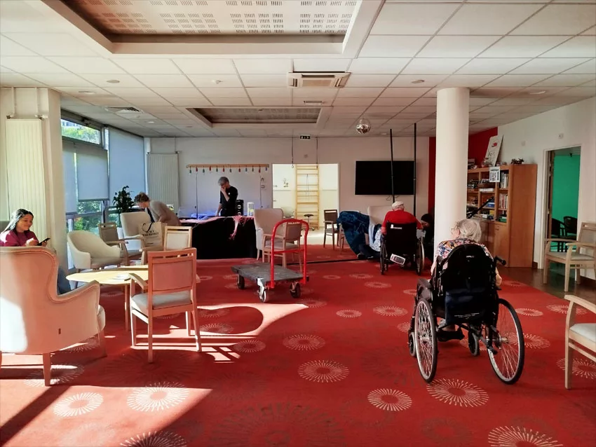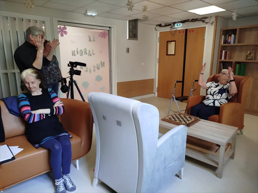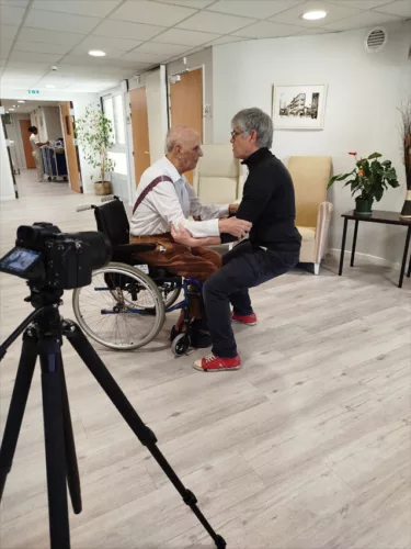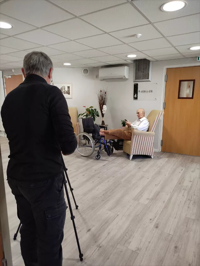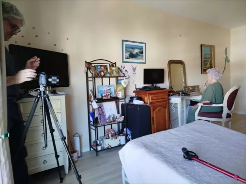 Dans cette unité, nous ne pouvons être accompagnés que par 3 personnes pour ne pas trop perturber les résidents. Aïcha, Casey et Emma viennent pour voir la séquence de Léo. L’installation dans le salon de l’unité protégée se fait discrètement et nous tournons rapidement.