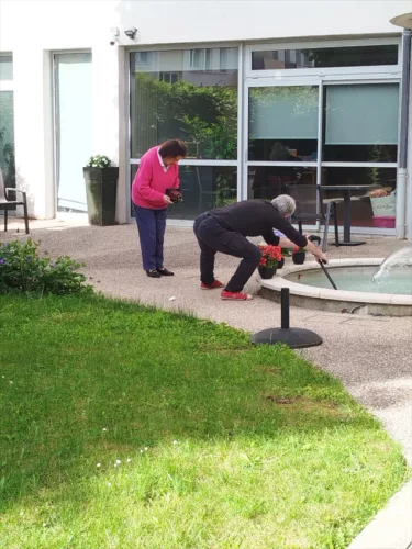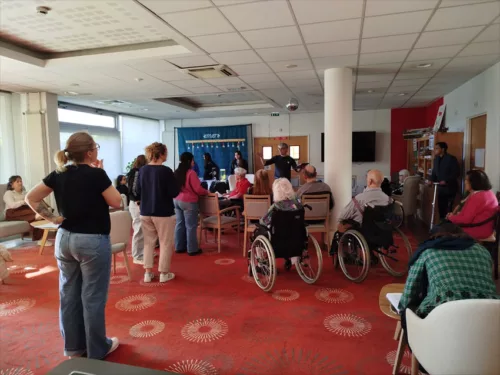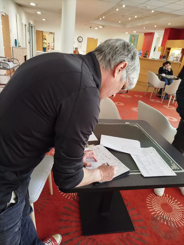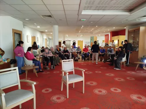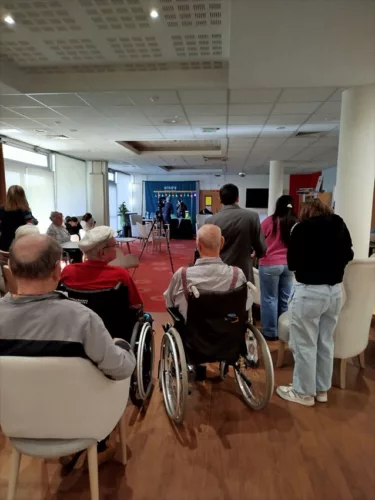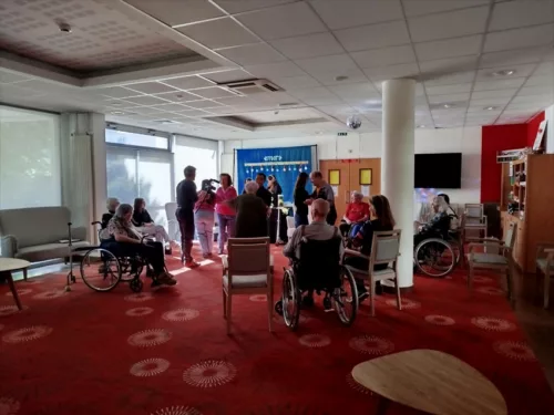 11h20 les élèves repartent pour prendre leur bus. Guillaume va tourner des plans extérieurs pour des raccords d’image et nous avançons le planning de cet après-midi de 30 minutes pour tenir les délais. Laëtitia prévient chaque résident et le personnel soignant de ces modifications.