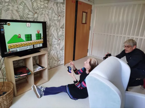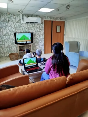 13h30, nous retournons dans l’unité protégée pour compléter la séquence de Léo sur le jeu vidéo avec Mme Nenin et retrouvons Mme Cotton sur place. Elles démarrent une partie de dames, puis Mme Cotton se met à jouer au jeu vidéo. Comme Mme Cotton oublie rapidement les consignes de tournage, nous allons vite et par petit bout. Avec cette technique, elle fini par se prendre au jeu et enregistre sa voix en 1 seule prise ! Pour conclure « Ben je ne m’attendais pas à ça ! Faire du cinoche, là. ». Mme Nenin termine la séquence avec sa disparition.
