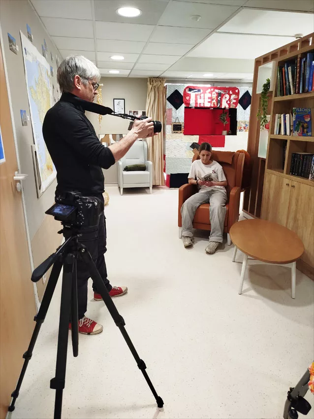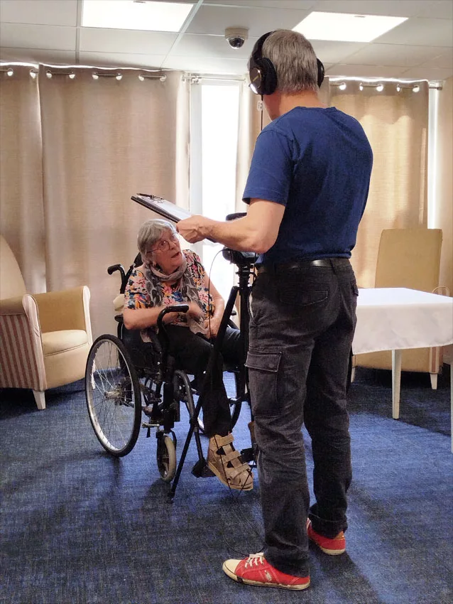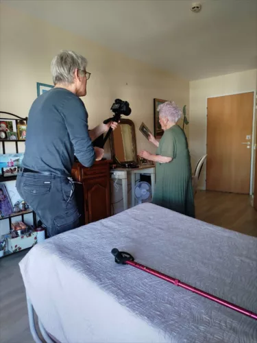 Rapidement, nous retournons à la bibliothèque de l’unité protégée pour la séquence « lecture » de Fanny. 2 caméras tournent pour plus de rapidité, une fixe et une mobile pour les plans de coupe. Mme Maréchal (résidente de l’unité protégée) est curieuse et fini par me raconter ses aventures sur le chemin de Compostelle.