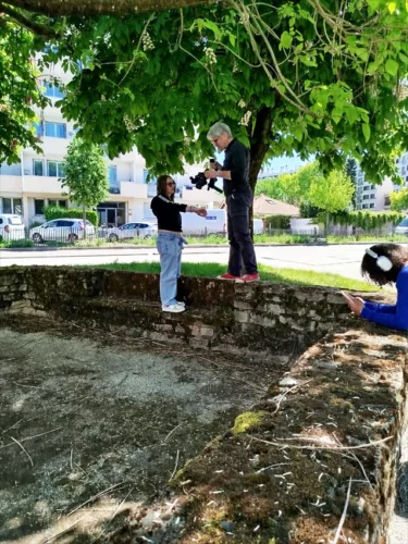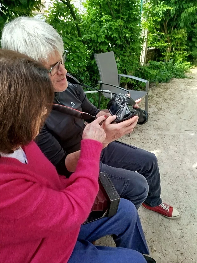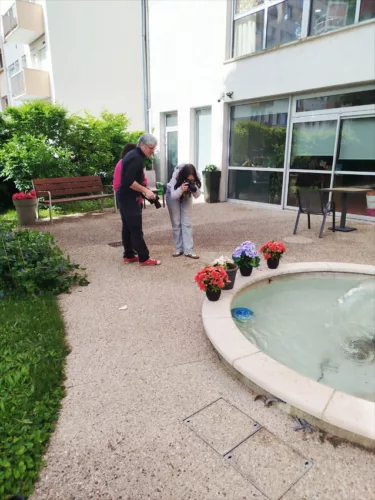 9h45, il est temps de retrouver Mme Sagevaillier au rez-de-chaussée pour la suivre en tant que reporter photo dans le jardin de La Pergola. Casey la suit pour doubler ses photos et Aya se prête à nouveau aux réglages lumières. Le tournage de cette séquence aura divertit bon nombre de résidents puisque nous étions dans le jardin entouré de baies vitrées !