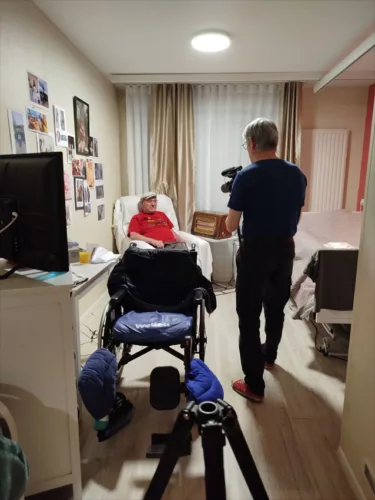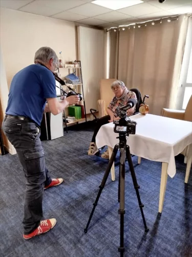 Nous filons au 3ème étage dans la chambre de M. Guinard pour sa séquence « radio ». Florence et Marion du lycée nous ont rejoints pour le plaisir de suivre le projet. Puis Florence et Guillaume installent M. Guinard dans son fauteuil pendant que Laetitia retourne au rez-de-chaussée pour chercher les accessoires manquants. Le temps de régler les problèmes de luminosité, tout se met en place. Comme à son habitude M. Guinard a toujours le mot pour rire et le tournage se passe dans la bonne humeur.