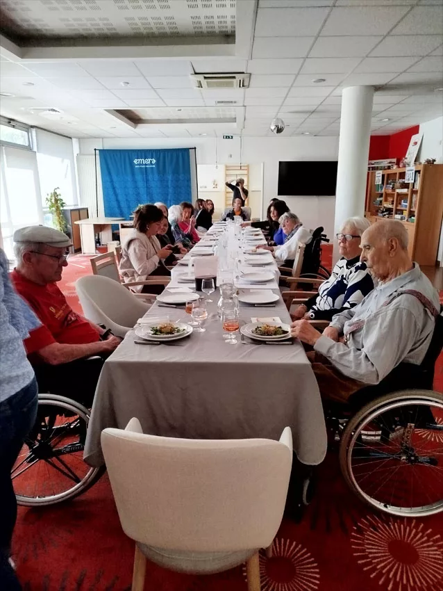 L’heure du déjeuner arrive à point nommé, il faut encore mettre des tables et chaises pour 25 personnes dans la salle commune et la pause bien méritée peut se faire pour toute l’équipe.