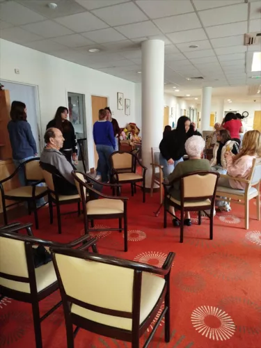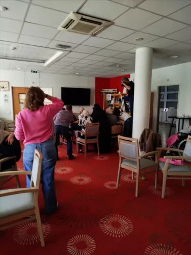 Durant toute la matinée, les lycéens s’occupent des résidents qui attendent leur tour pour les photos ou qui sortent de séance, cela va de la chorégraphie sur chaise à la discussion en passant par une petite animation musicale.