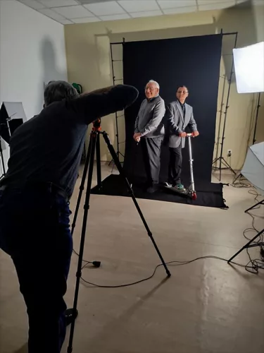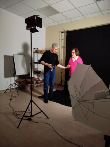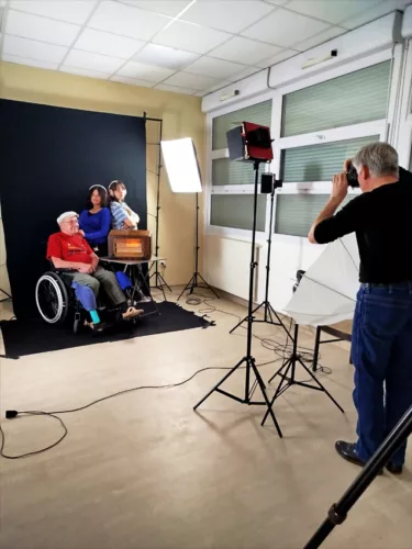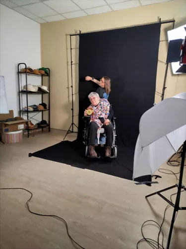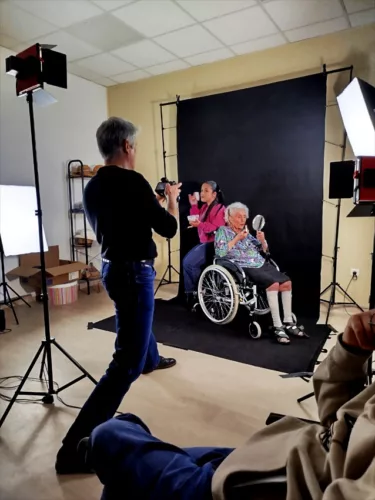 En ce moment, l’Ehpad la Pergola accueille 2 stagiaires en animation, Eloïse, photo-amateur, suit activement les réglages lumières et Manal qui regarde de façon plus discrète et s’occupe des résidents.