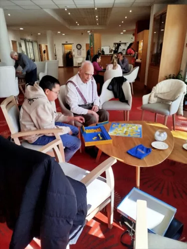 Comme hier, les autres restent avec les résidents : Léo joue à un jeu de société avec M. Aguilar, Emma lit le journal aux résidents quand d’autres discutent et vont chercher les résidents pour leur séance photo.