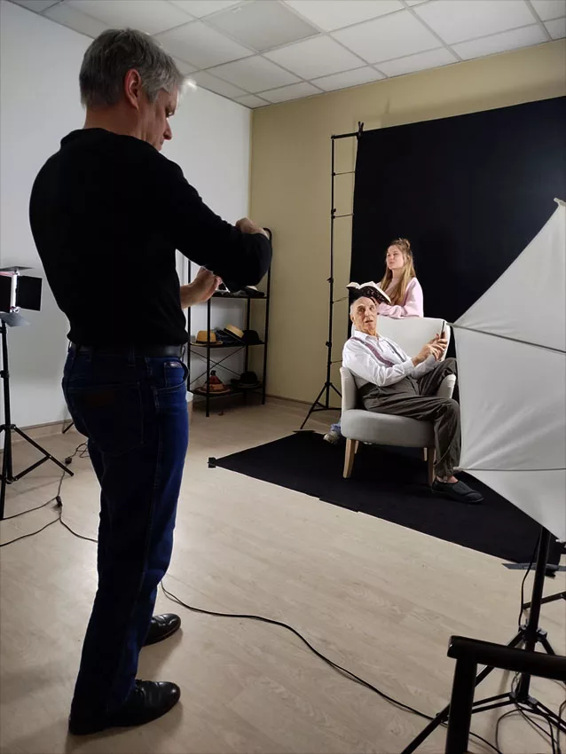 M. Aguilar est déjà prêt, il nous attend pour sa photo. Fanny récupère ses livres, ils prennent la pose, c’est partie pour la photo « lecture ». Après avoir vu les premiers clichés, M. Aguilar propose d’en refaire quelques unes pour avoir une expression plus naturelle. Pendant la photo de portrait de M. Aguilar, Fanny choisi son chapeau avec Emma et Florence.