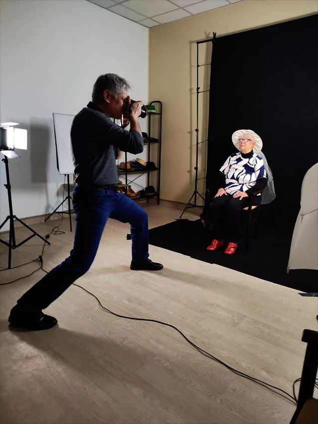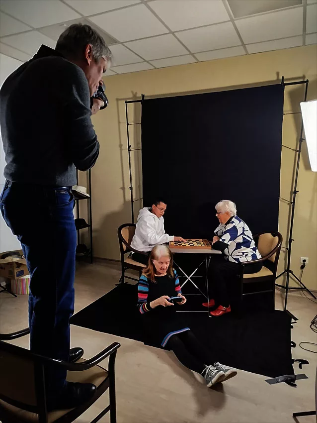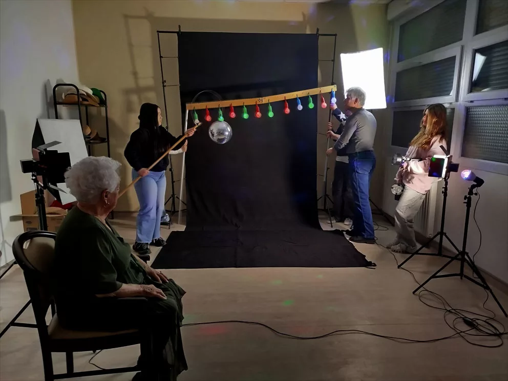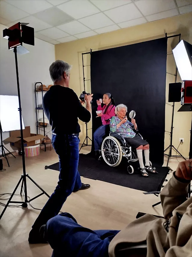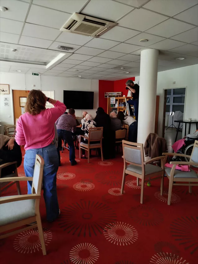 En ce moment, l’Ehpad la Pergola accueille 2 stagiaires en animation, Eloïse, photo-amateur, suit activement les réglages lumières et Manal qui regarde de façon plus discrète et s’occupe des résidents.