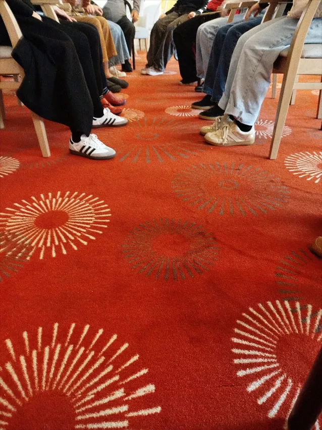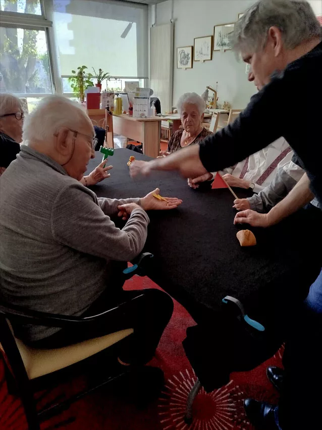 Comme hier, les autres restent avec les résidents : Léo joue à un jeu de société avec M. Aguilar, Emma lit le journal aux résidents quand d’autres discutent et vont chercher les résidents pour leur séance photo.