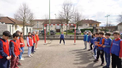 Ce matin les CE2 aboutissent leur story board et la première scène se tourne dans la cour de l’école : une partie de foot avec un ballon « magique » filmé en stop-motion et quelques gros plans.