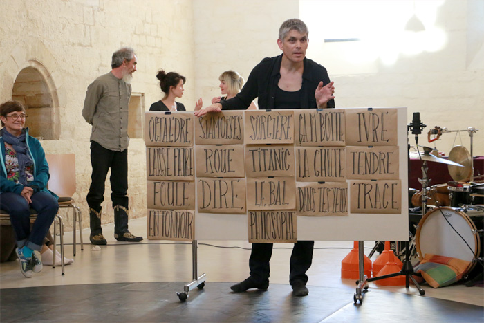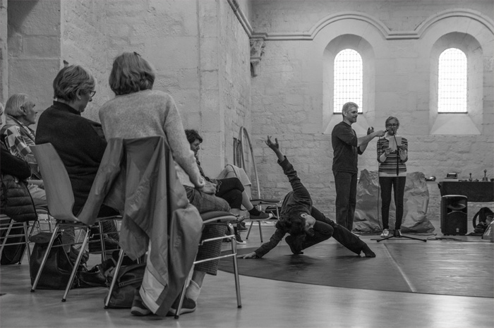 Dernier travail de répétition avant l’arrivée des participants à 18 heures pour la présentation publique de 19 heures. 18 heures, c’est l’arrivée des participants, la préparation de la salle et les derniers réglages. L’ouverture des portes se fait avec quelques minutes de retard et le public peut enfin entrer dans la chapelle de la Léproserie.