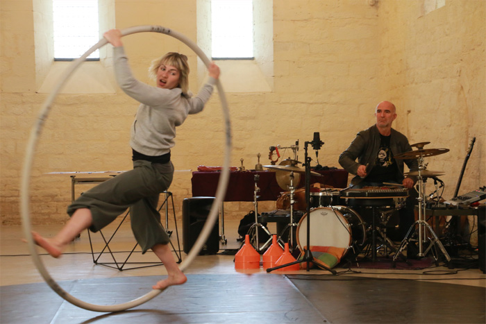 « L’octaèdre » est un motif travaillé tout au long de la semaine avec les amateurs lors des ateliers. Ce moment est un moment où la scène se partage avec le chant de Claudine et Stephen. Après cet intermède didactique sur la méthode de construction du spectacle et de ce qui vient d’être vu, la présentation reprend sur la « cible sensible », poème d ‘Odile suivi d’une incroyable improvisation dansée sur un duo de trompe de chasse – batterie.