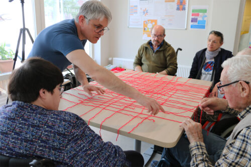 Dans la deuxième partie de la matinée, nous démarrons le stop-motion avec des fils pour symboliser le travail de Pénélope. Guillaume et Franck-Noël préparent le tissage pour qu’il se défasse à l’image. Chacun tire sur quelques fils devant eux pour le tournage. Comme pour la séance précédente Guillaume fait le montage en direct pour pouvoir montrer le résultat aux participants de la matinée.