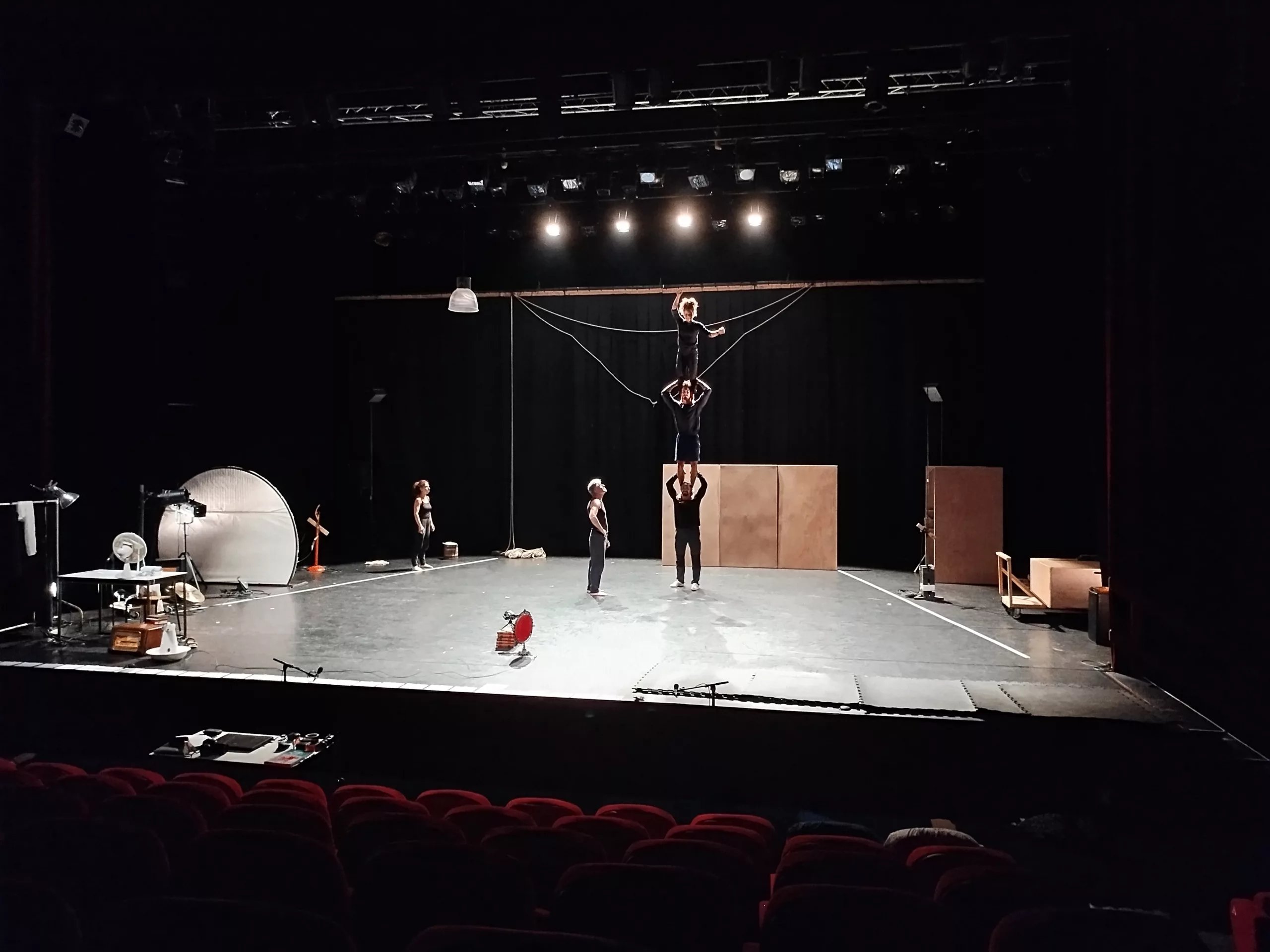 Dans la transition entre les 2 phases et la transformation de l’espace, les objets deviennent agrès, les « châssis de théâtre» deviennent des supports pour aller plus haut, ils dévoilent, masquent et modifient les espaces de jeux.