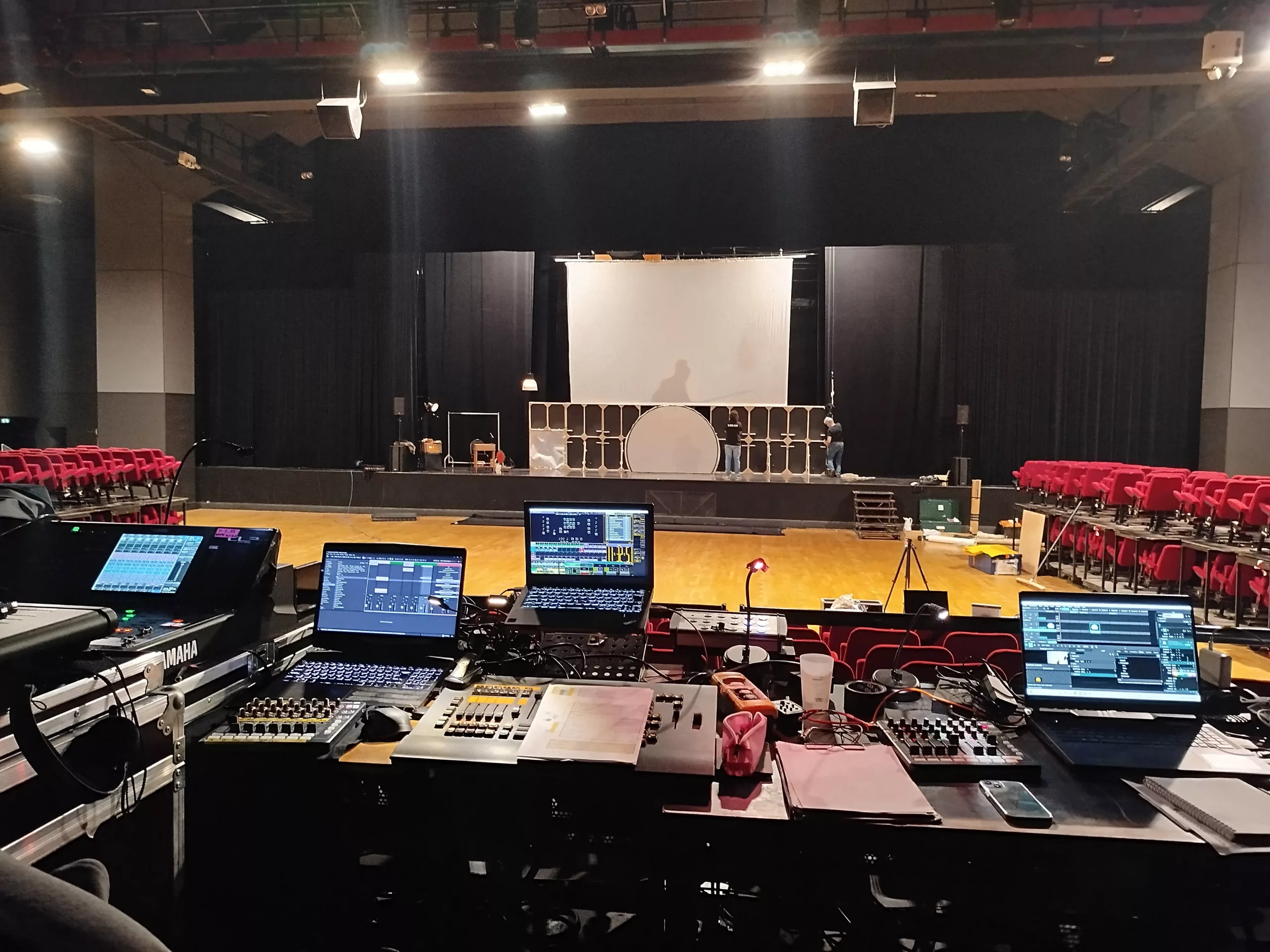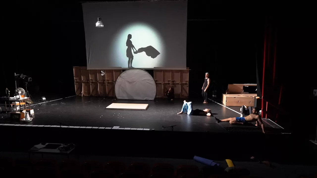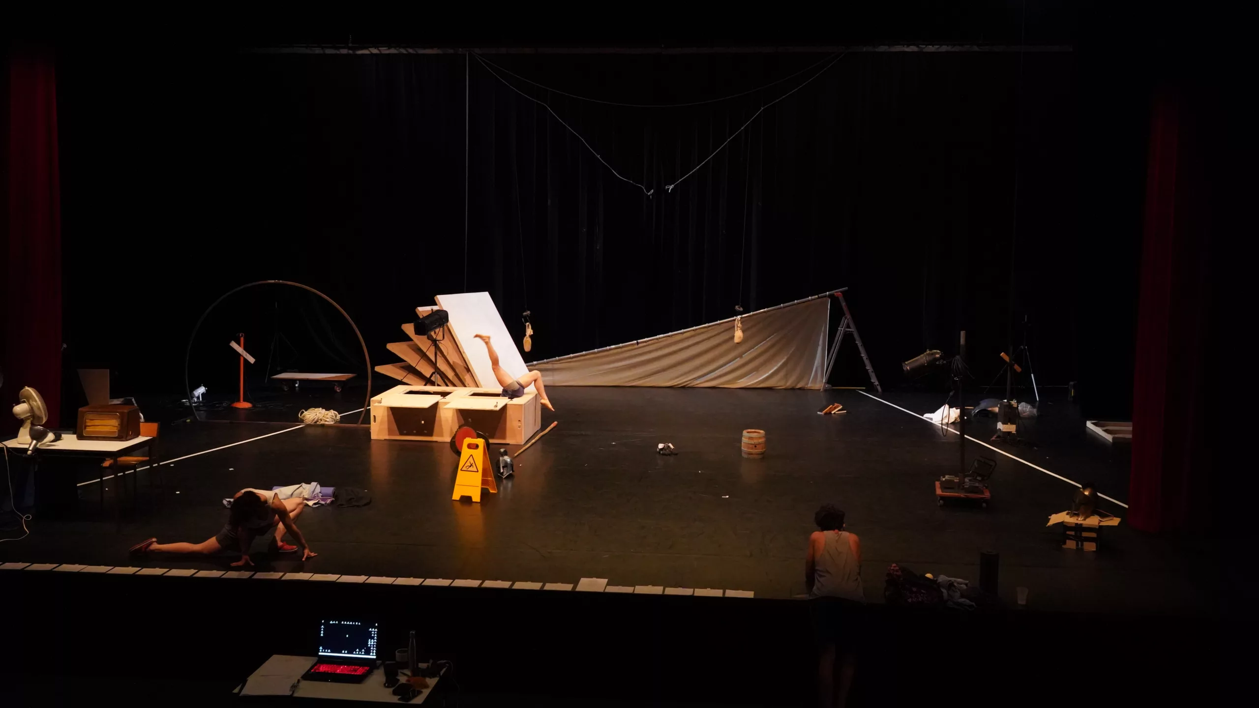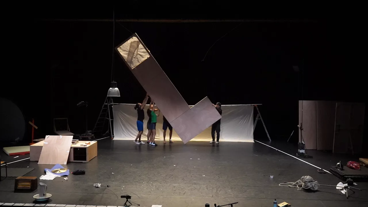L’espace scénique s’assemble en partie en jeu depuis un plateau avant l’installation du décor. (Phase 1)