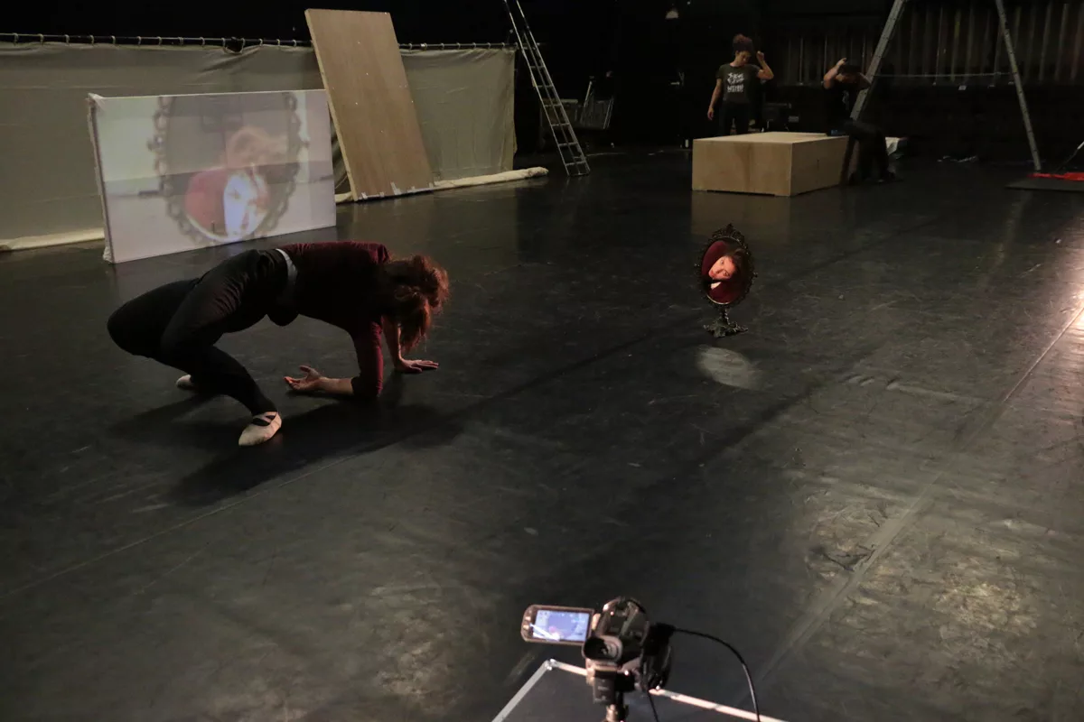 La vidéo se projette sur le fond du décor, se pose sur des surface en mouvement, offre des repères narratifs, déborde et se reflète dans la coulisse.